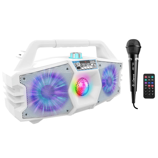 iDance• Portable All-In-One Karaoke Party System• Wireless Speaker with Disco Lights in the two Woofers• Bring the Party anywhere!• 100 watts with Crysta...